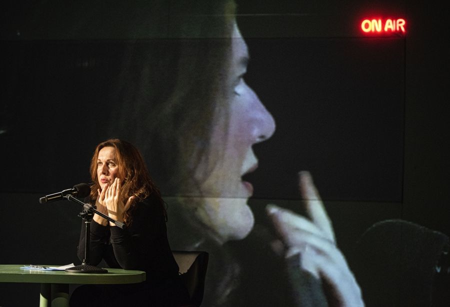 Oksana Czerkaszyna, Oskar Stoczyński, Joanna Wichowska, Krysia Bednarek „Radio Mariia”, reż. Roza Sarkisian, Teatr Powszechny, Warszawa, 2022. Fot. Magda Hueckel