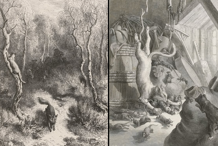 „Kot i Lis”, „Kot i Szczur stary” La Fontaine’a, Grafiki Gustave’a Dorée, 1868.