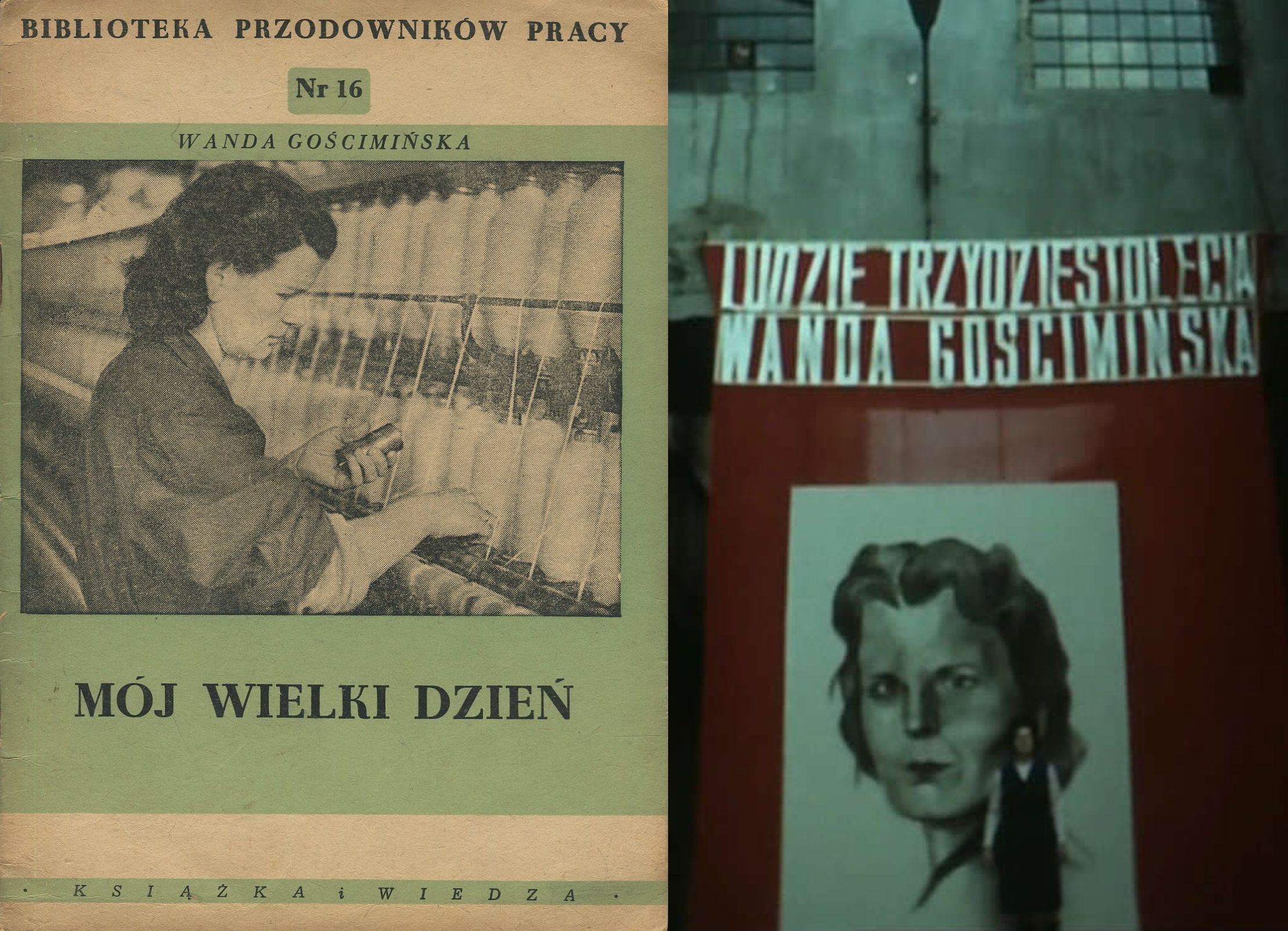 Książka Wandy Gościmińskiej z serii "Biblioteka Przodowników Pracy" oraz kadr z filmu Wojciecha Wiszniewskiego "Włókniarka"