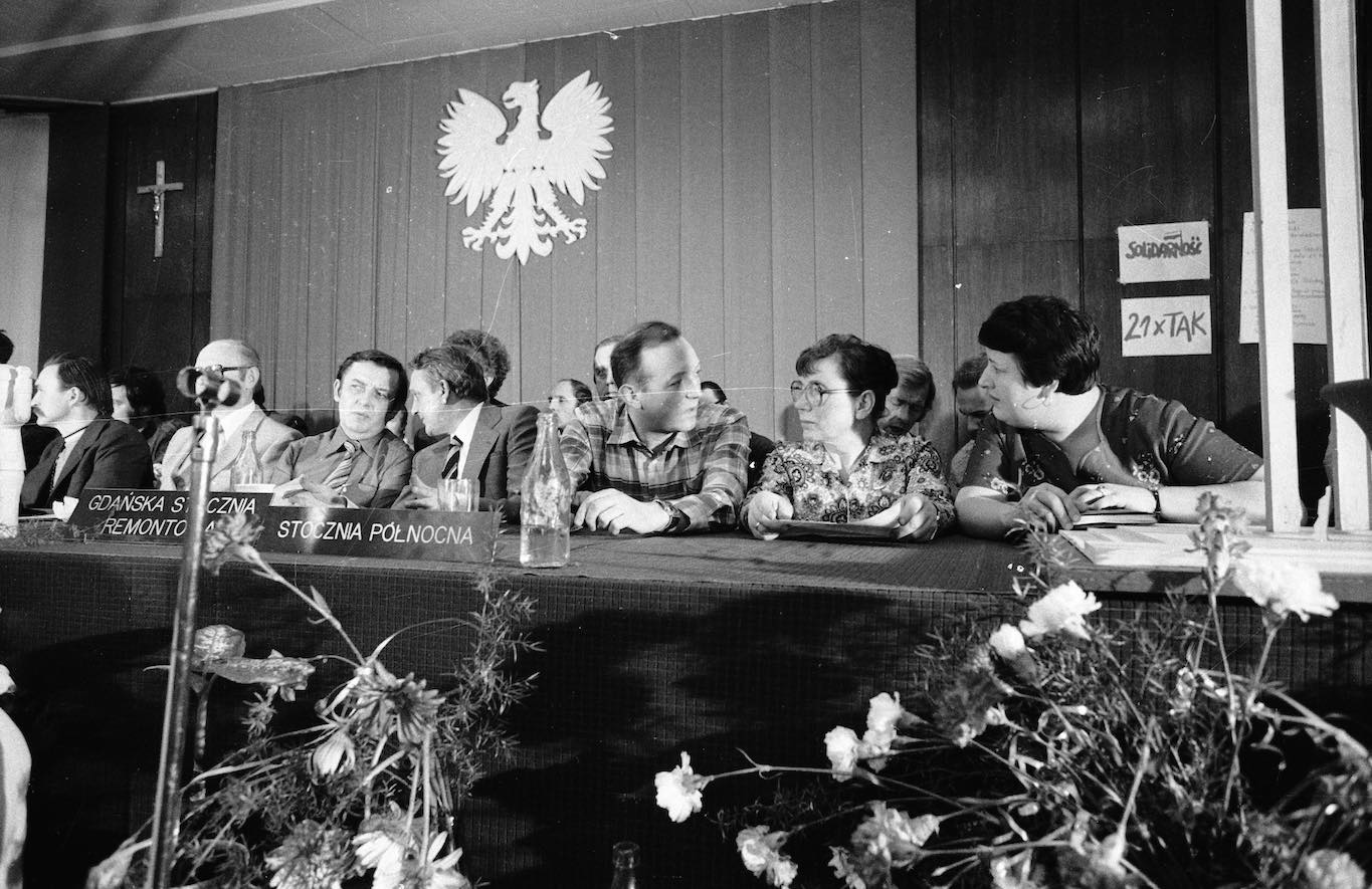 Na planie „Człowieka z żelaza” w reż. Andrzeja Wajdy. Scena podpisania porozumień sierpniowych. Na zdjęciu Henryka Krzywonos, Anna Walentynowicz. Fot. Jacek Uklejewicz/CAF/PAP