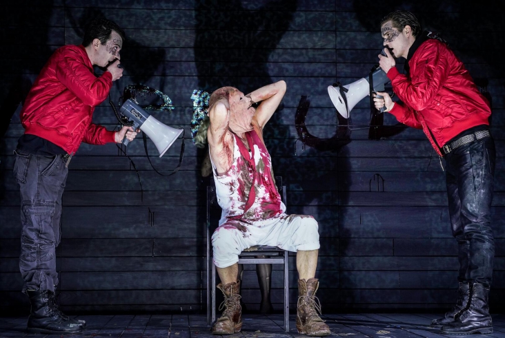 Właściwa część spektaklu rozgrywa się w dwóch planach, wzajemnie się przenikających i uzupełniających. Plan pierwszy, realistyczny, stanowi platforma ustawiona z przodu sceny, na której w pierwszych sekwencjach pojawiają się krzesła i stół, wokół którego zbierać się będą poszczególne postacie by toczyć jałowe polityczne spory o kształt władzy, jaką chcą lub jaką zmuszeni są tworzyć. Reżyserka pozwala aktorom na długotrwałe szekspirowskie debaty, dialogi i monologi, jakby chcąc podkreślić, że to przy stołach, w zaciszu gabinetów, a nie na polach walk, o których mówi Koriolan, Cezar, czy Antoniusz, zazwyczaj ważą się losy społeczeństw. Jałowość tych politycznych konklawe w inscenizowanych sytuacjach tragicznych wynika z prostego faktu, że wygrywa zawsze ten, kto pierwszy sięgnie po, mniej lub bardziej metaforyczny, nóż. Krew zalewająca poszczególne postaci tego spektaklu, mimo że nanoszona w sposób metateatralny, nie wytraca swojej siły – znaku symbolizującego moralne zniszczenie człowieka owładniętego władzą. Krew na rękach ma każdy tyran, bo jej rozlew jest jedyną drogą gwarantującą jedynowładztwo. Niemal wszystkie postacie na scenie umazane są krwią, w całości lub tylko na rękach, ale za to po łokcie. Krwią „szlachetnych ran” bohatera i błotem pokryty jest Koriolan (Michael Goldberg), ręce po łokcie we krwi nosi zabójca Cezara, Brutus (Felix Goeser), krwią pokryte są również dłonie Antoniusza (Manuel Harder).